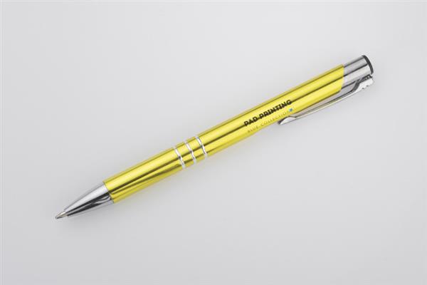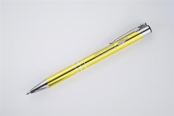 Metalowy długopis KALIPSO o metalizowanej chromowanej powierzchni. Długopis automatyczny z 3 ringami i niebieskim wkładem. Logo grawerujemy na powierzchni długopisu.