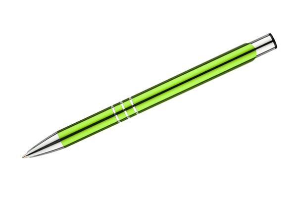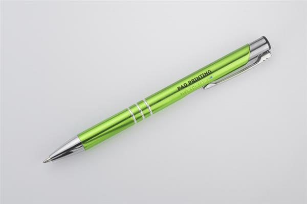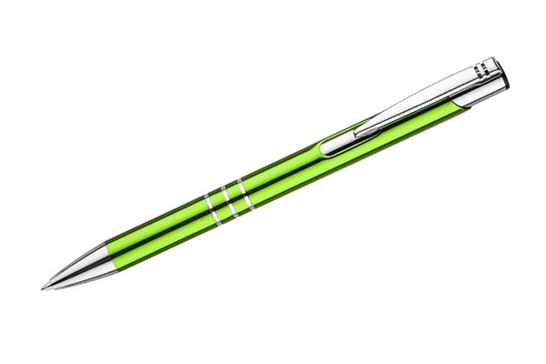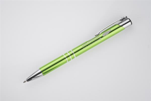Metalowy długopis o metalizowanej chromowanej powierzchni. Długopis automatyczny z 3 ringami i niebieskim wkładem. Logo grawerujemy na powierzchni długopisu.