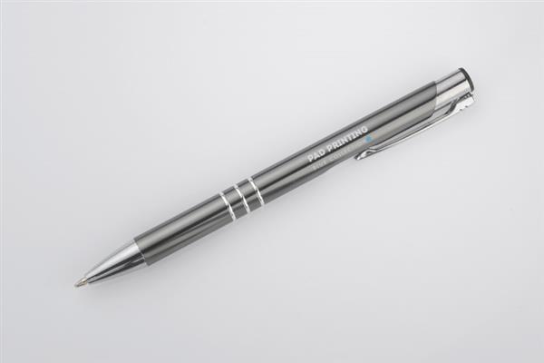 Metalowy długopis o metalizowanej chromowanej powierzchni. Długopis automatyczny z 3 ringami i niebieskim wkładem. Logo grawerujemy na powierzchni długopisu.