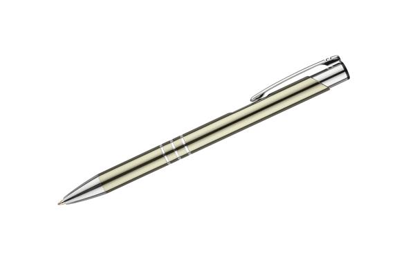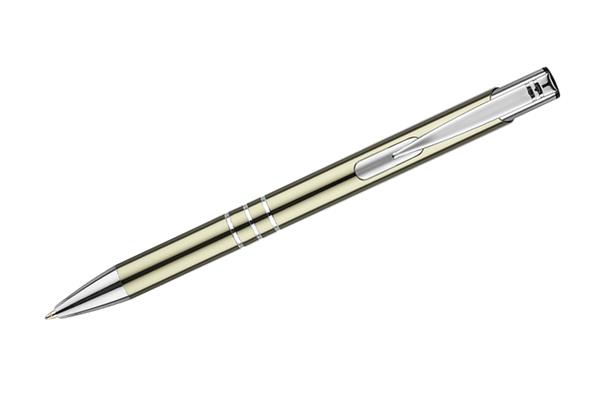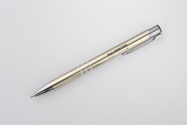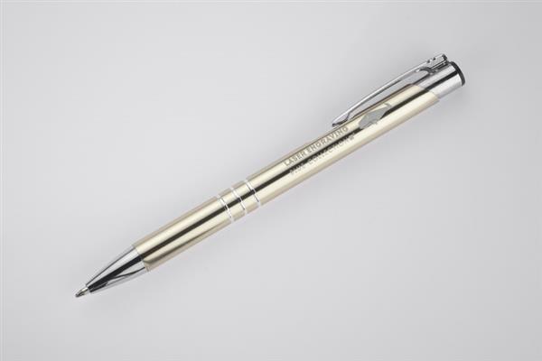 Metalowy długopis KALIPSO o metalizowanej chromowanej powierzchni. Długopis automatyczny z 3 ringami i niebieskim wkładem. Logo grawerujemy na powierzchni długopisu.