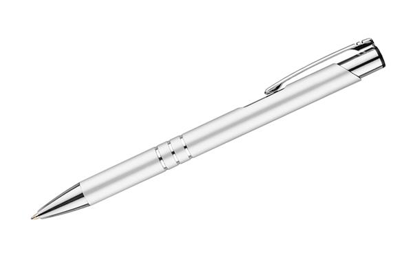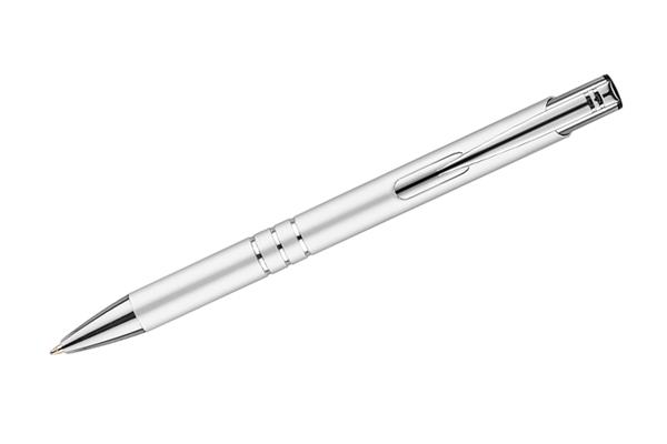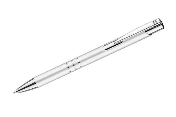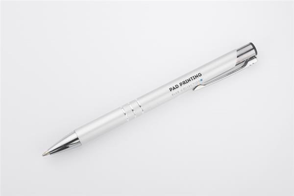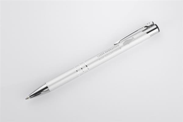 Metalowy długopis o metalizowanej chromowanej powierzchni. Długopis automatyczny z 3 ringami i niebieskim wkładem. Logo grawerujemy na powierzchni długopisu.