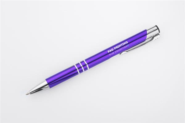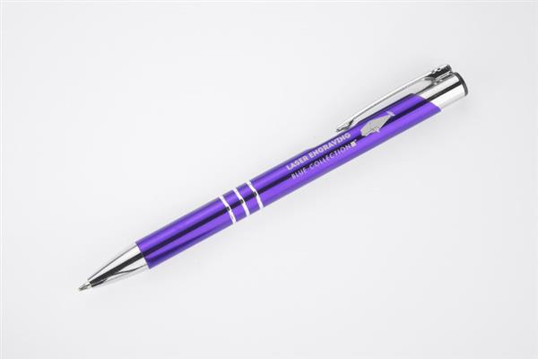 Metalowy długopis o metalizowanej chromowanej powierzchni. Długopis automatyczny z 3 ringami i niebieskim wkładem. Logo grawerujemy na powierzchni długopisu.