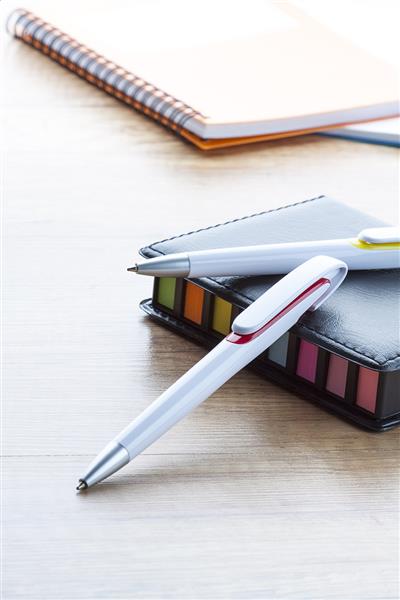 Plastikowy długopis z białym korpusem i srebrną koncówką. Z niebieskim wkładem.