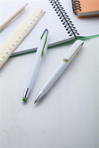 Plastikowy długopis z białym korpusem i srebrną koncówką. Z niebieskim wkładem.
