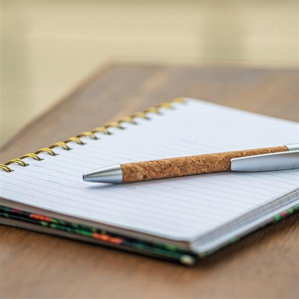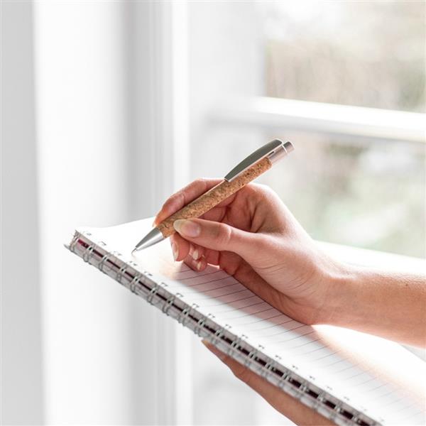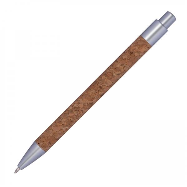 Ekologiczny długopis z korpusem korkowym, z niebieskim wkładem o dużej pojemności.