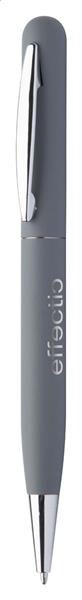 Metalowy długopis z gumowanym korpusem i niebieskim wkładem. Idealny pod grawer lustrzany.