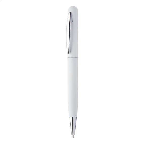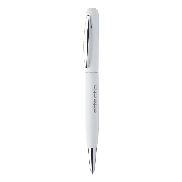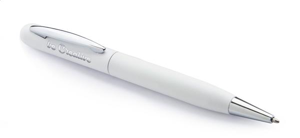 Metalowy długopis z gumowanym korpusem i niebieskim wkładem. Idealny pod grawer lustrzany.