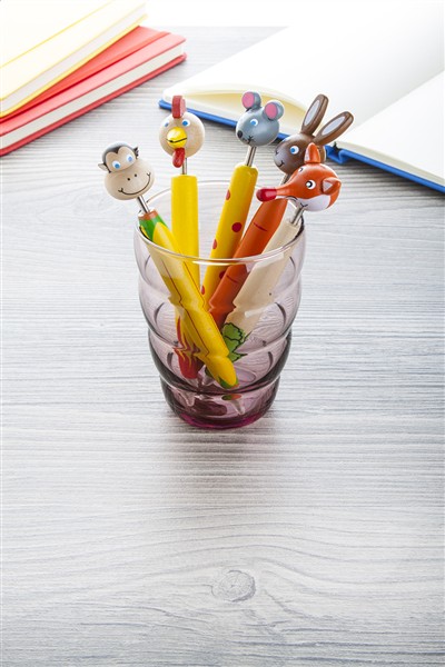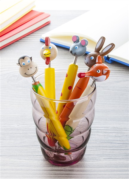 Drewniany długopis z figurką zwierzęcia. Z niebieskim wkładem.