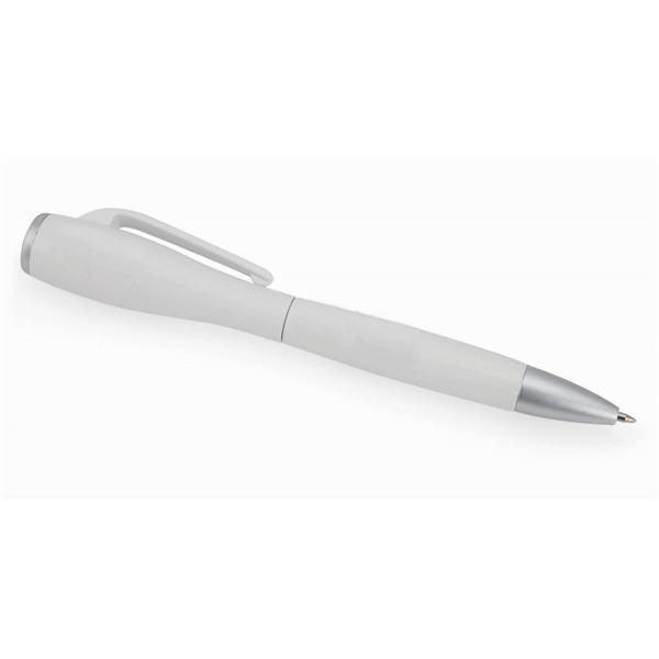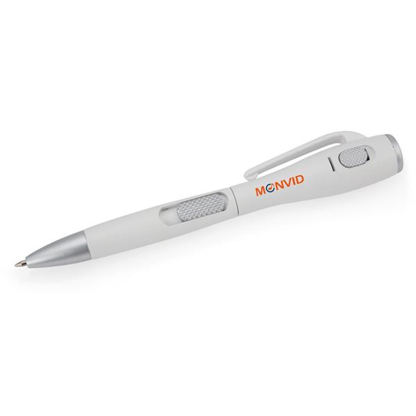 Długopis z lampką LED, wkład w niebieskim kolorze, profilowany trzon o dużej średnicy ułatwia chwyt, produkt wykonany z ABS