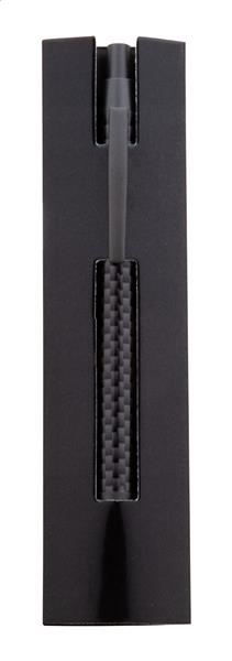 Metalowy długopis z korpusem ze wzorem karbonowym w papierowym etui. Z niebieskim wkładem.