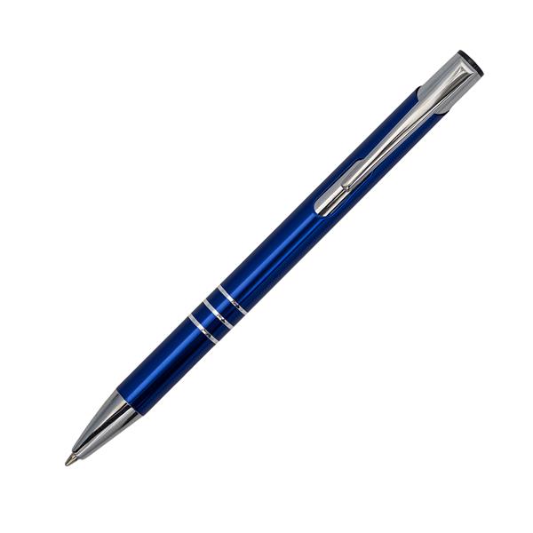 Długopis aluminiowy. Wyposażony w niebieski wkład.