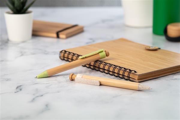 Bambusowy długopis z ekologicznymi elementami plastikowymi wykonanymi ze słomy pszenicznej. Z niebieskim wkładem.