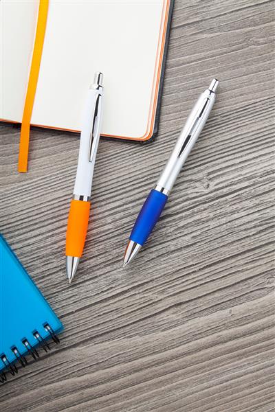 Plastikowy długopis z kolorowym gumowym uchwytem z niebieskim wkładem.