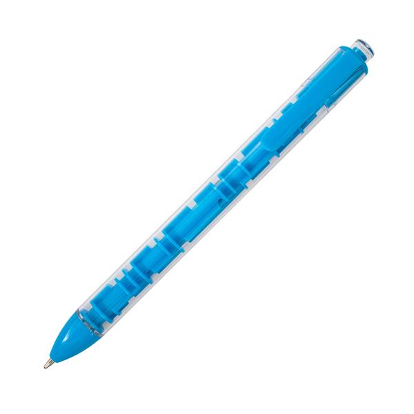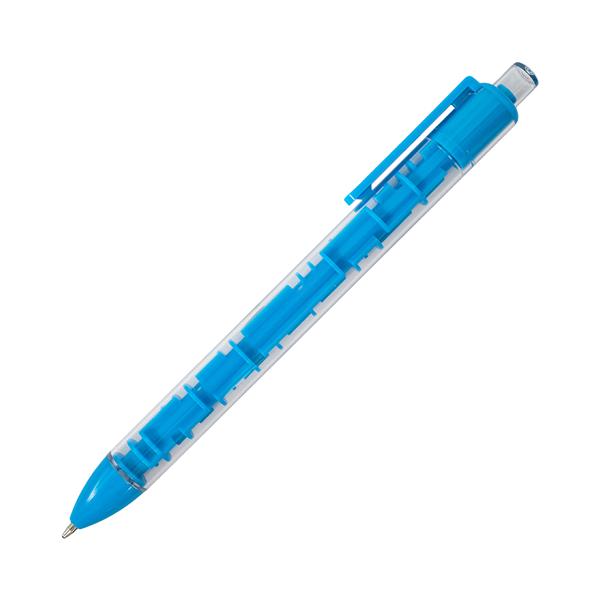 Oryginalny długopis z przezroczystym korpusem i wbudowanym labiryntem z dwiema metalowymi kulkami. Wkład w kolorze niebieskim.