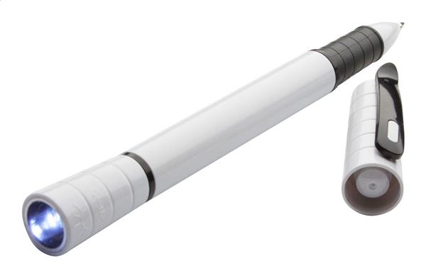 Plastikowy długopis z latarką LED. Dostarczany z niebieskim wkładem.