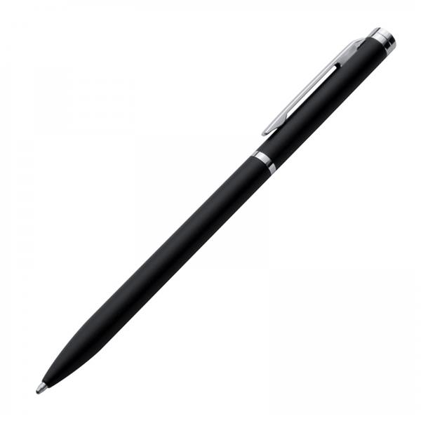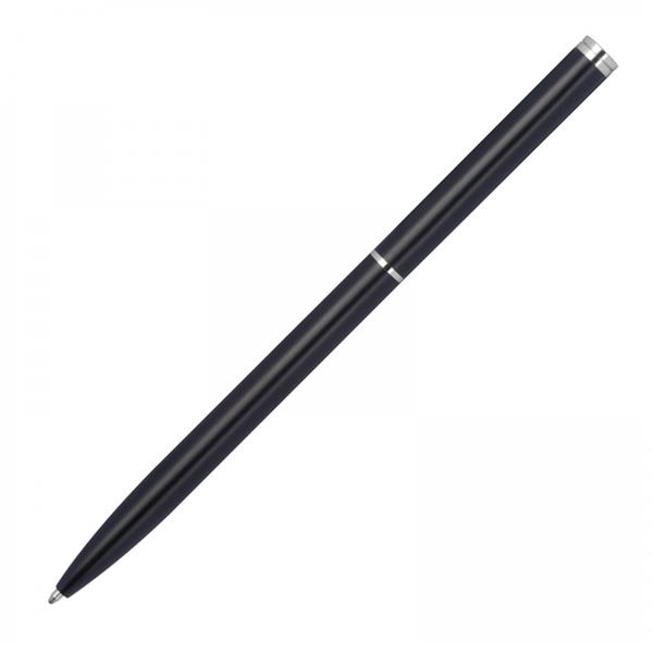 Metalowy długopis z chromowanym klipsem i wkładem piszącym na niebiesko.