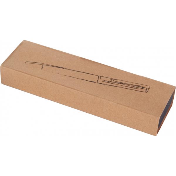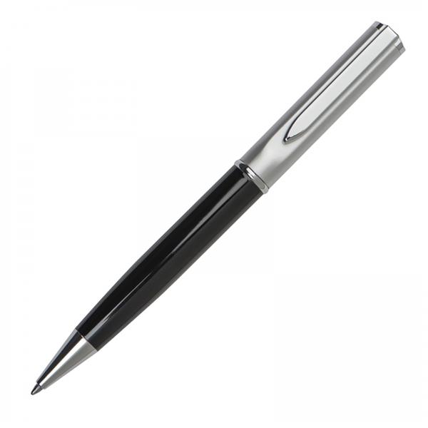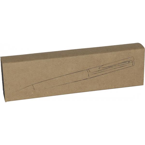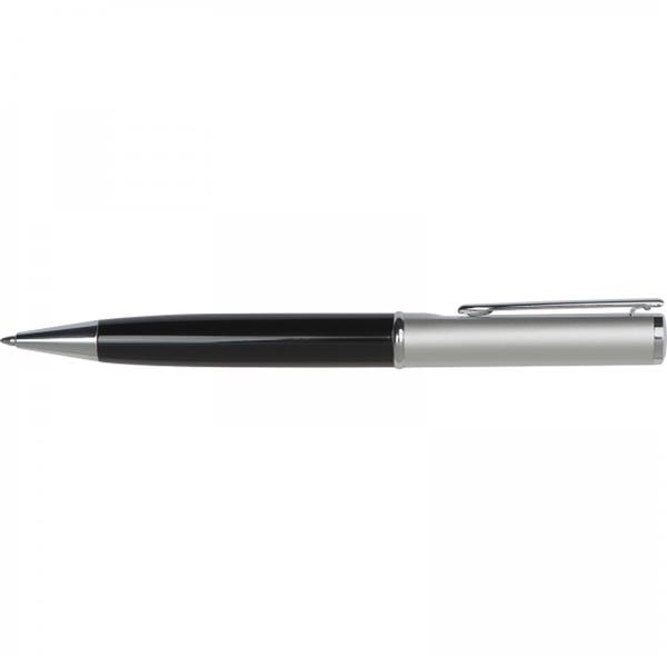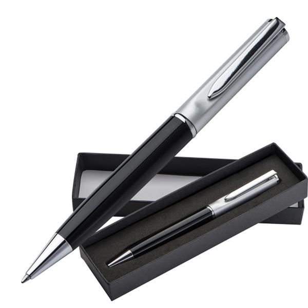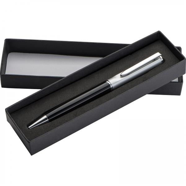Długopis metalowy ze srebrnym wykończeniem i niebieskim wkładem o dużej pojemności. Zapakowany w kartonowe pudełko.