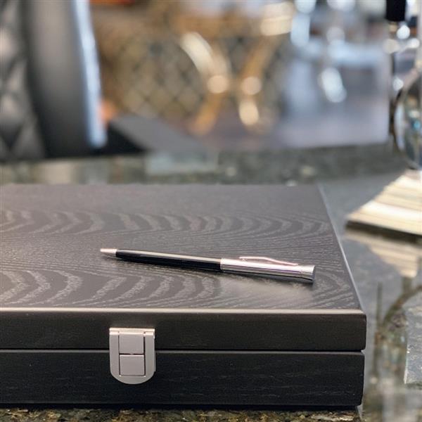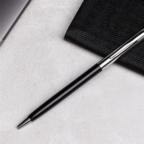 Długopis metalowy z mechanizmem obrotowym i wkładem piszącym na niebiesko.