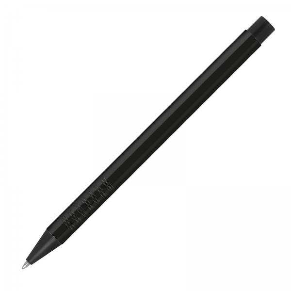 Metalowy długopis z piszącym na niebiesko wkładem o dużej pojemności i ze zdobieniem na korpusie.