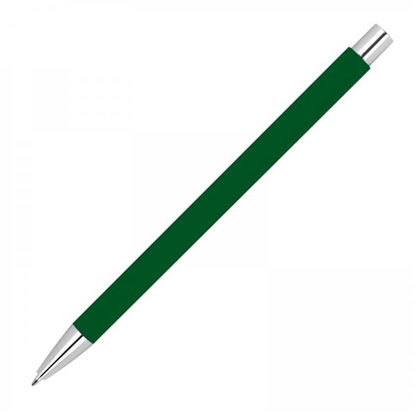 Smukły, metalowy długopis z powierzchnią soft touch, srebrnymi elementami i niebieskim wkładem.