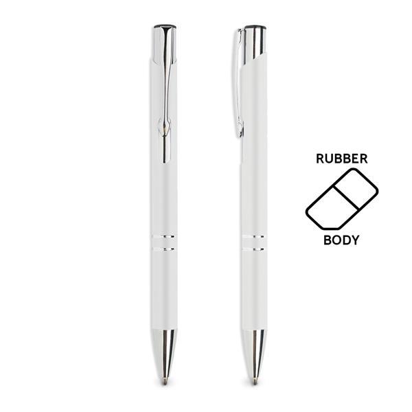 Długopis aluminiowy z gumowaną powierzchnią, soft touch oraz z mechanizmem wciskanym. Pisze na czarno. Rozmiar: 13,5 x 0,8 cm L1 (grawer laserowy): 5 x 0,6 cm DC0 (długopisy, zapalniczki): 5 x 0,5 cm Kolor: Biały