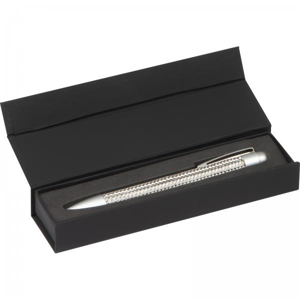 Oryginalny długopis wykonany z wysokiej jakości metalu. Zachwyca swą unikalną formą oraz jakością wykonania. Logotyp proponujemy umieścić na klipsie.