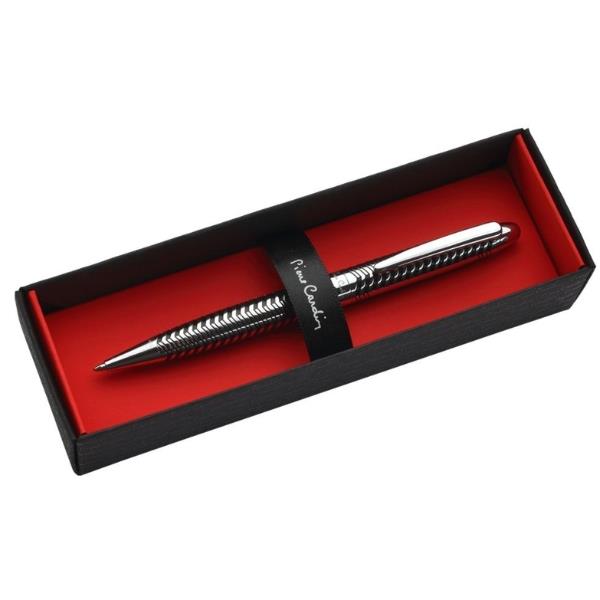 Luksusowy długopis metalowy z charakterystycznym, grawerowanym korpusem i czarnymi elementami. Wyposażony w wysokiej jakości niebieski wkład z końcówką 1 mm. W zestawie z wkładem zapasowym piszącym na czarno. Zapakowany w eleganckie pudełko prezentowe z certyfikatem autentyczności Pierre Cardin.