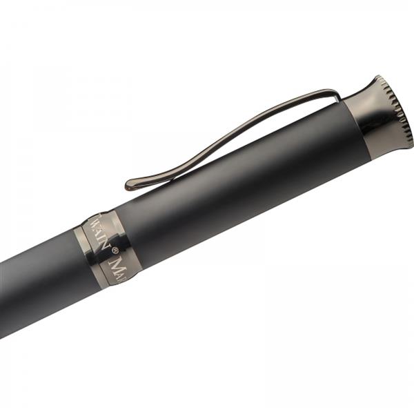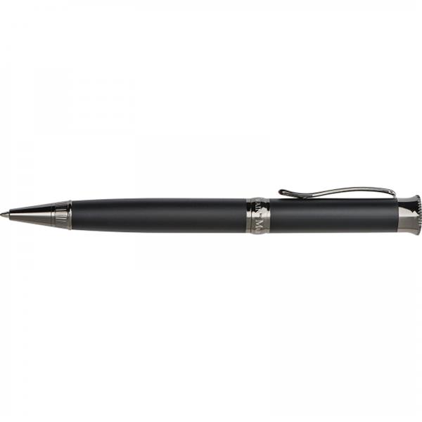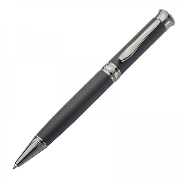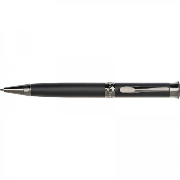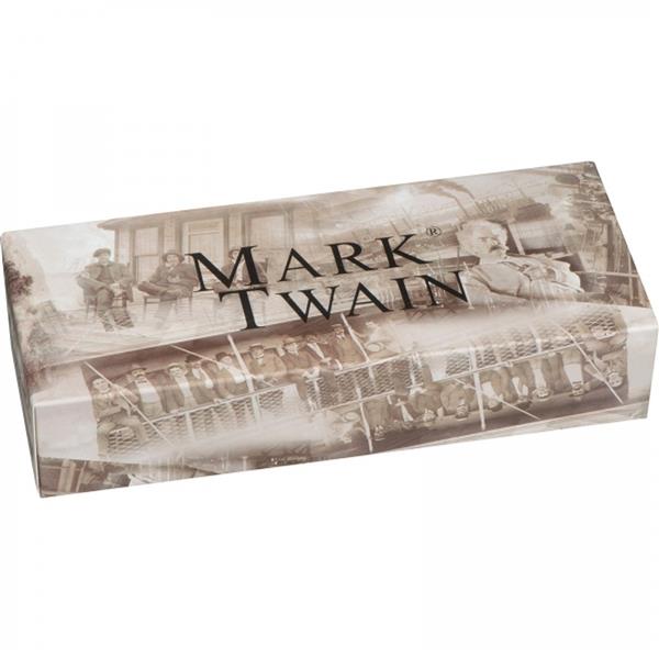 Metalowy długopis marki Mark Twain z chromowanymi elementami i dużym wkładem piszącym na niebiesko. Zapakowany w eleganckie etui.