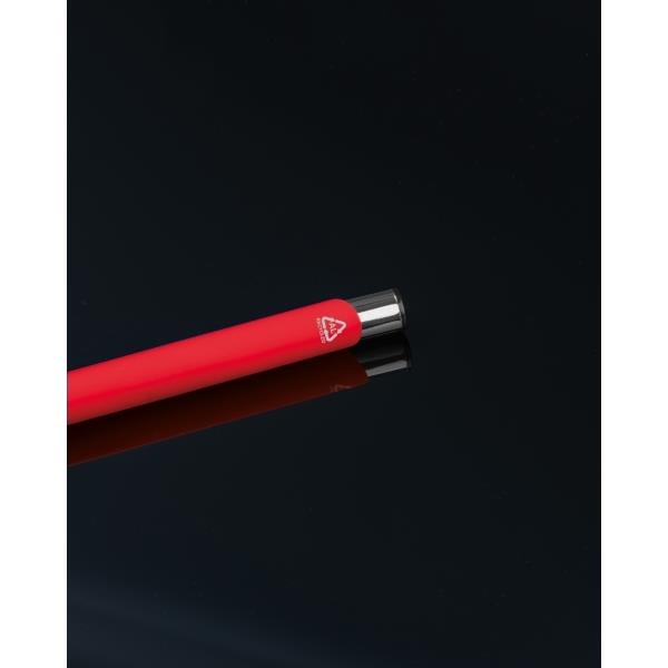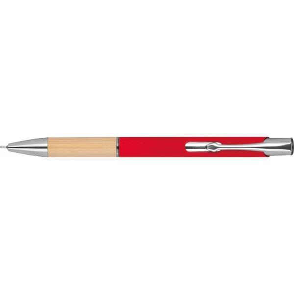 Piszący na niebiesko, półżelowy długopis wykonany z aluminium pochodzącego z recyklingu ze srebrnymi elementami i bambusową strefą uchwytu.