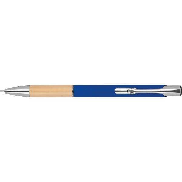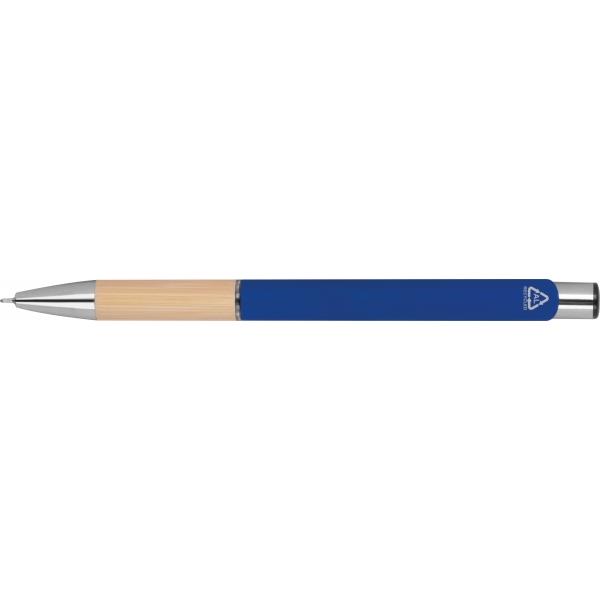 Piszący na niebiesko, półżelowy długopis wykonany z aluminium pochodzącego z recyklingu ze srebrnymi elementami i bambusową strefą uchwytu.