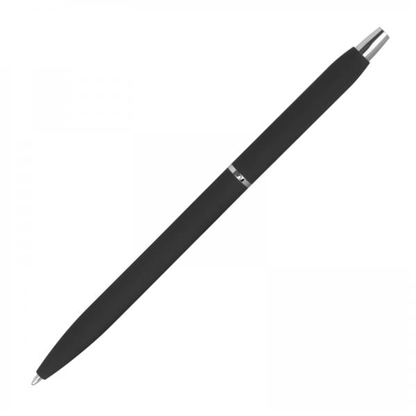 Metalowy długopis o gumowanej powierzchni ze srebrnymi akcentami. Posiada wkład piszący na czarno.