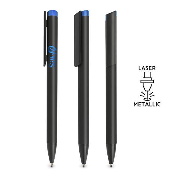 Czarny długopis z mechanizmem wciskanym z gumową, antypoślizgową powłoką, soft touch i kolorową końcówką. Długopis posiada wkład piszący na niebiesko. Grawer wychodzi w kolorze końcówki. Rozmiar: 13,5 x 1 cm L1 (grawer laserowy): 5 x 0,6 cm Kolor: Royal blue