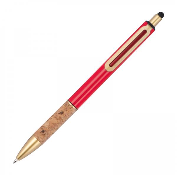 Metalowy długopis ze złotymi elementami i korkową strefą uchwytu. Posiada gumkę do obsługi ekranów dotykowych oraz wkład piszący na niebiesko.