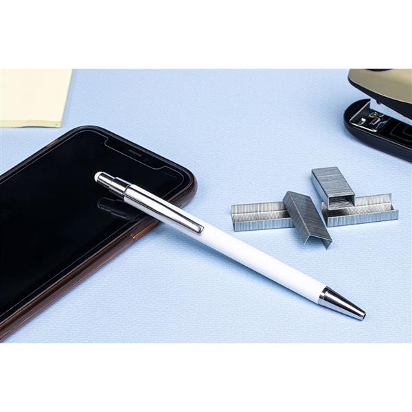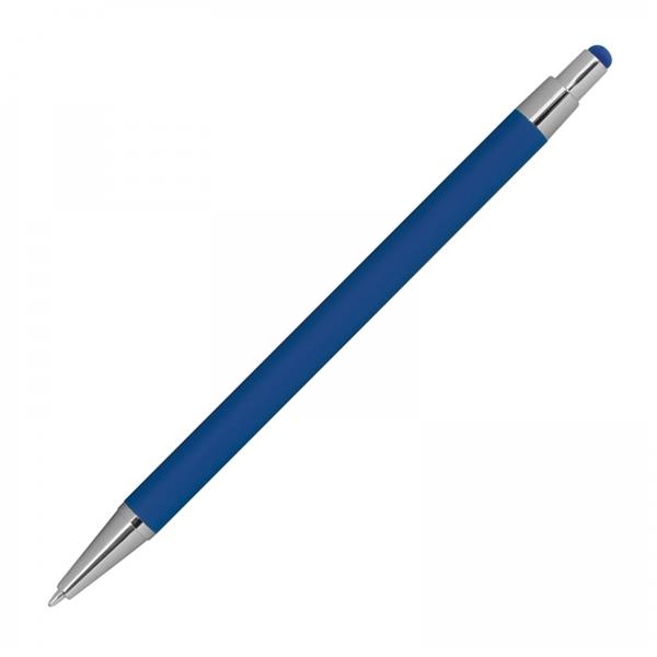 Długopis z aluminium z gumowaną powierzchnią. Posiada wkład piszący na niebiesko i końcówkę do obsługi ekranów dotykowych.