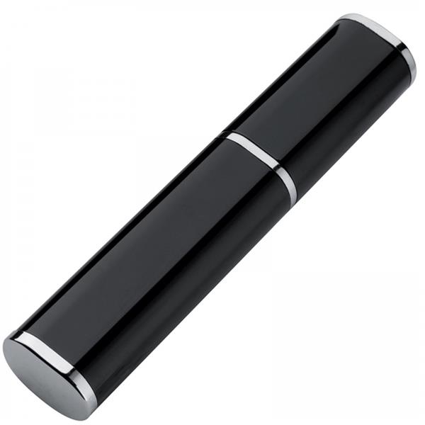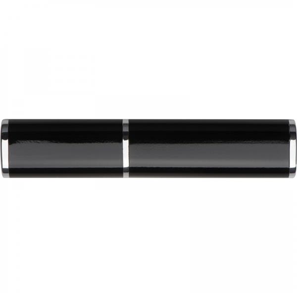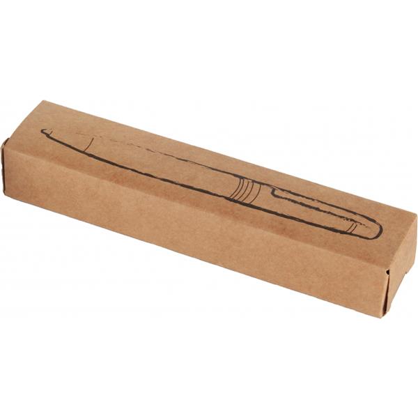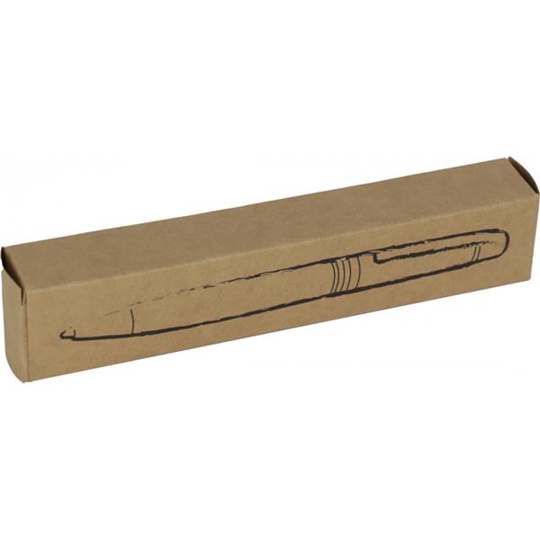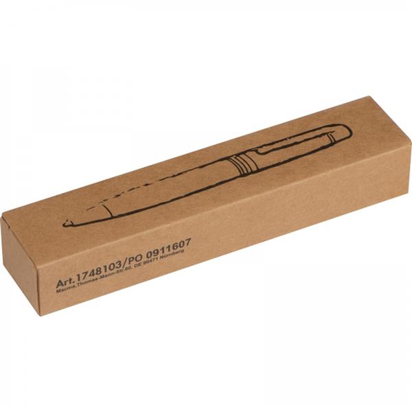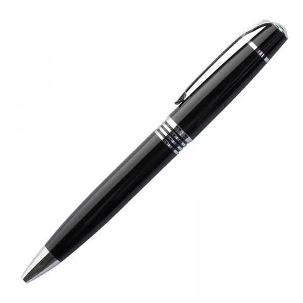 Metalowy długopis z mechanizmem obrotowym, z wkładem piszącym na niebiesko, umieszczony w metalowym etui.