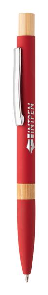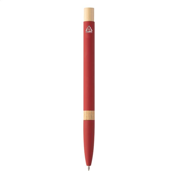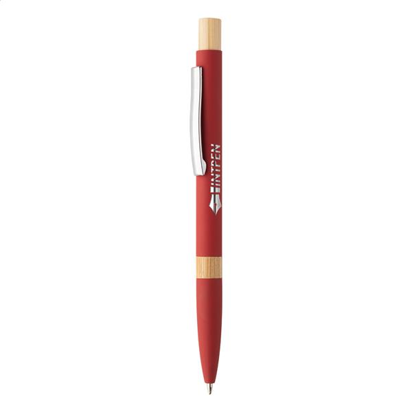 Długopis z aluminium pochodzącego z recyklingu, z częściami bambusowymi, gumowanym wykończeniem i chromowanym klipem. Ze specjalną powłoką pod grawer lustrzanyo. Z niebieskim wkładem.