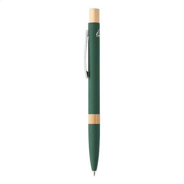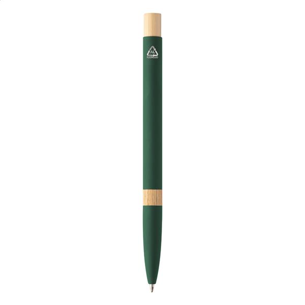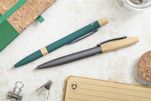 Długopis z aluminium pochodzącego z recyklingu, z częściami bambusowymi, gumowanym wykończeniem i chromowanym klipem. Ze specjalną powłoką pod grawer lustrzanyo. Z niebieskim wkładem.