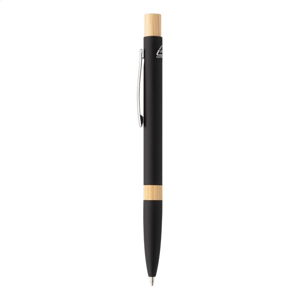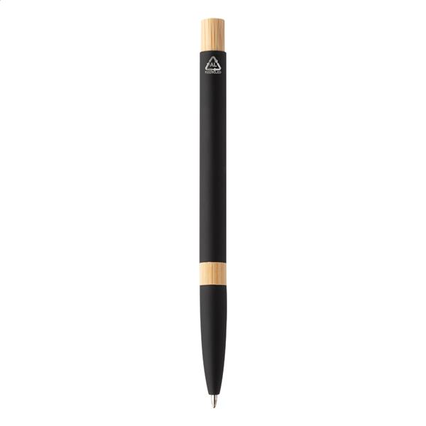 Długopis z aluminium pochodzącego z recyklingu, z częściami bambusowymi, gumowanym wykończeniem i chromowanym klipem. Ze specjalną powłoką pod grawer lustrzanyo. Z niebieskim wkładem.