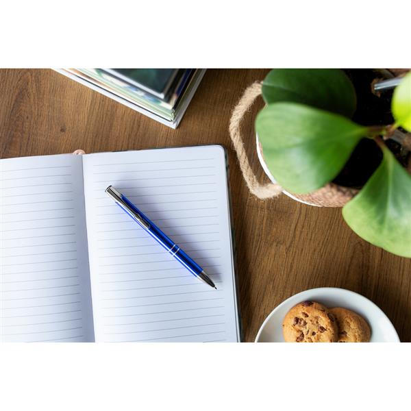 Długopis z kolorowym trzonem o błyszczącym wykończeniu, posiada elementy w srebrnym kolorze, wkład w niebieskim kolorze, produkt wykonany z aluminium
