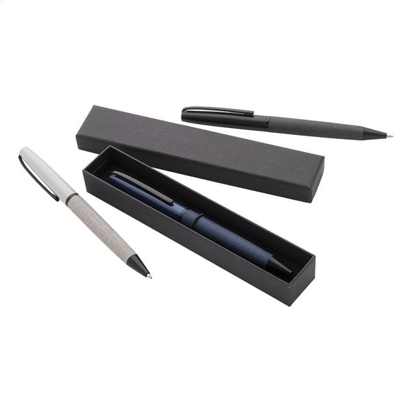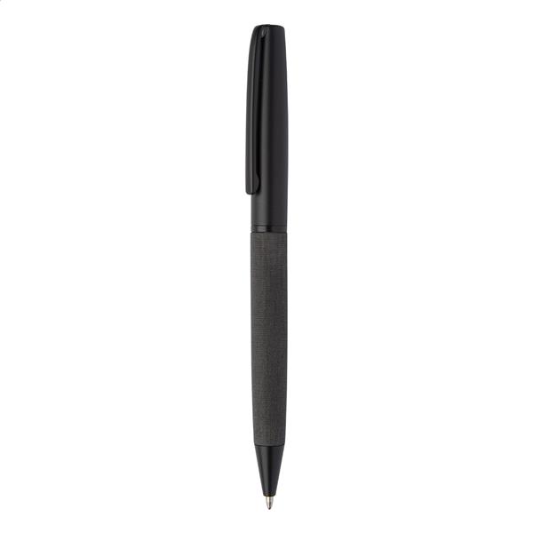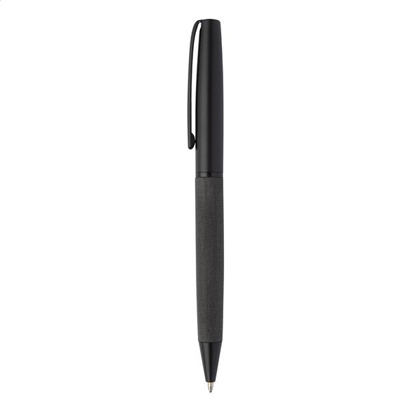 Elegancki, metalowy przekręcany długopis z korpusem pokrytym skórą PU i czarnymi elementami. W czarnym pudełku upominkowym. Z niebieskim wkładem.