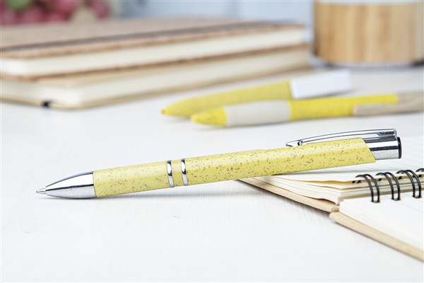 Ekologiczny długopis z plastiku ze słomy pszenicznej z metalowymi elementami. W niebieskim wkładem.