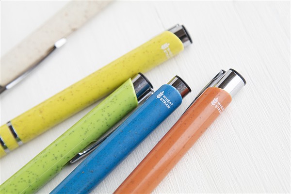 Ekologiczny długopis z plastiku ze słomy pszenicznej z metalowymi elementami. W niebieskim wkładem.