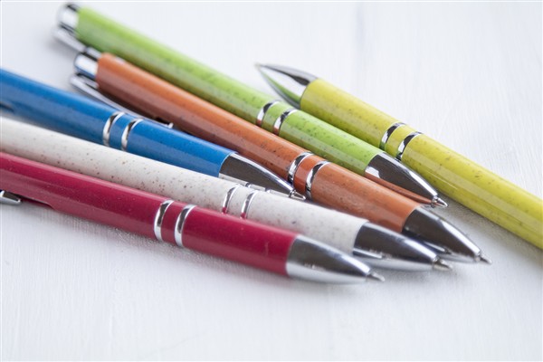 Ekologiczny długopis z plastiku ze słomy pszenicznej z metalowymi elementami. W niebieskim wkładem.
