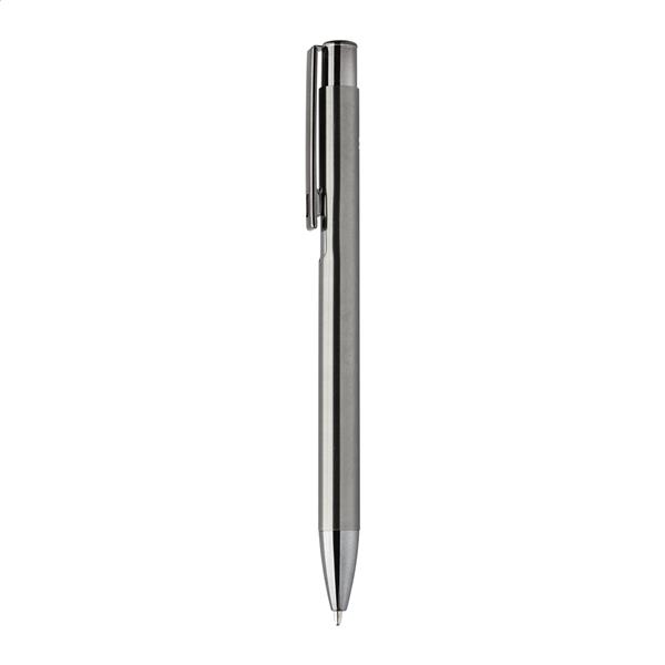 Długopis z recyklingowanego aluminium z błyszczącym metalicznym wykończeniem. Z niebieskim wkładem.