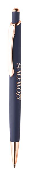Długopis wykonany z aluminium pochodzącego z recyklingu, z gumowanym wykończeniem i detalami w kolorze różowego złota. Ze specjalną powłoką pod grawer lustrzany w kolorze różowego złota. Z niebieskim wkładem.