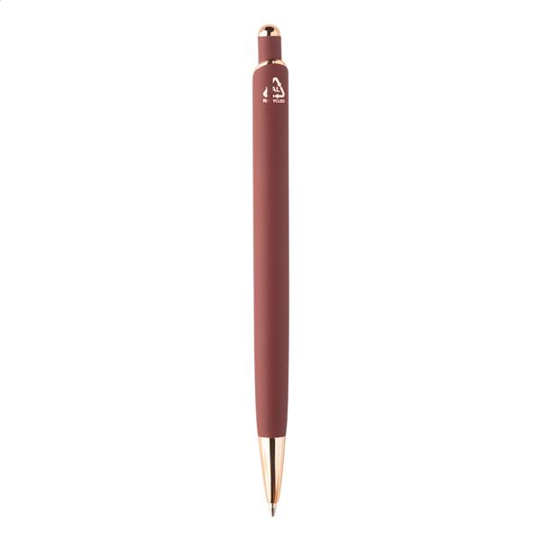 Długopis wykonany z aluminium pochodzącego z recyklingu, z gumowanym wykończeniem i detalami w kolorze różowego złota. Ze specjalną powłoką pod grawer lustrzany w kolorze różowego złota. Z niebieskim wkładem.