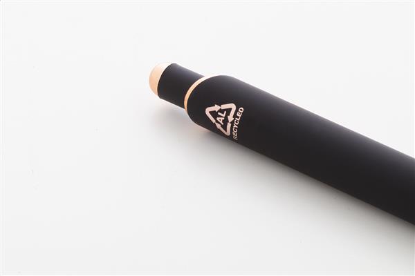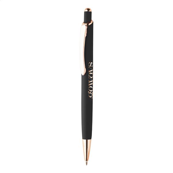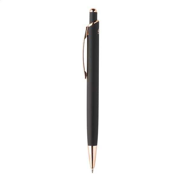Długopis wykonany z aluminium pochodzącego z recyklingu, z gumowanym wykończeniem i detalami w kolorze różowego złota. Ze specjalną powłoką pod grawer lustrzany w kolorze różowego złota. Z niebieskim wkładem.