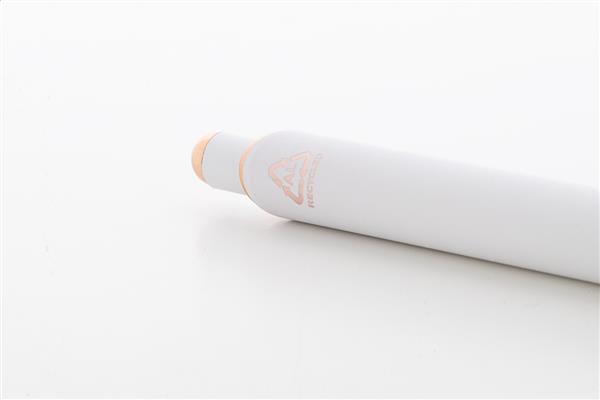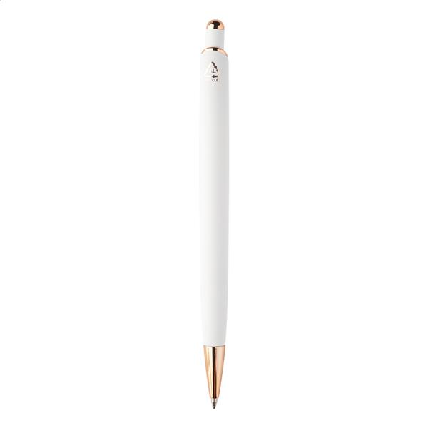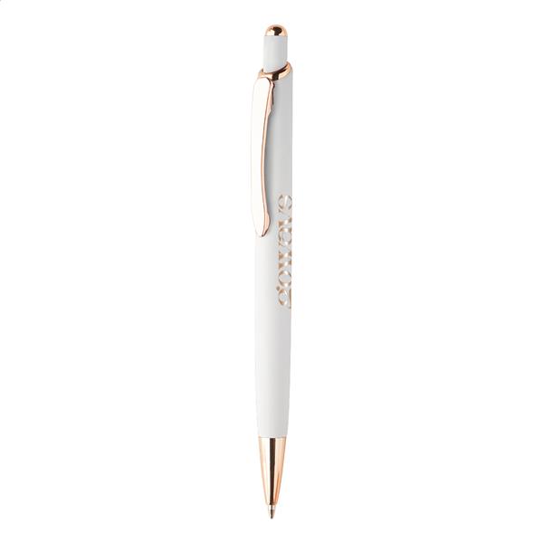 Długopis wykonany z aluminium pochodzącego z recyklingu, z gumowanym wykończeniem i detalami w kolorze różowego złota. Ze specjalną powłoką pod grawer lustrzany w kolorze różowego złota. Z niebieskim wkładem.