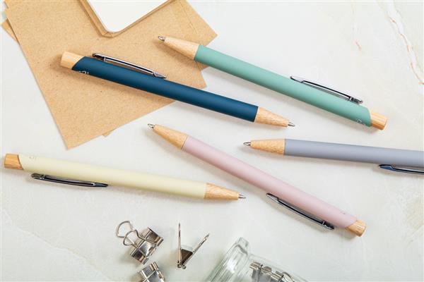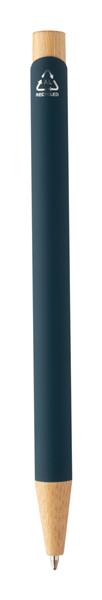 Długopis z aluminium pochodzącego z recyklingu, z częściami bambusowymi, gumowanym wykończeniem i chromowanym klipem. Ze specjalną powłoką pod grawer lustrzany. Z niebieskim wkładem.