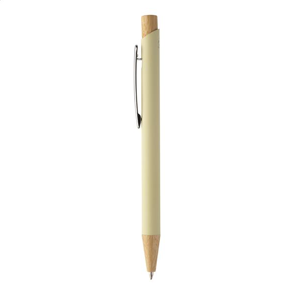 Długopis z aluminium pochodzącego z recyklingu, z częściami bambusowymi, gumowanym wykończeniem i chromowanym klipem. Ze specjalną powłoką pod grawer lustrzany. Z niebieskim wkładem.